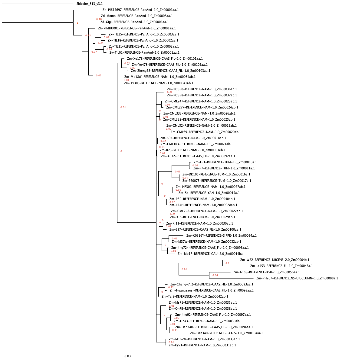 The Zea mays pan-gene analysis was generated by MaizeGDB staff, using the Pandagma pipeline. Details of each analysis are presented on separate tabs on the pan-gene record pages. Note that pan-gene analyses generated out by different software is likely to produce different results.